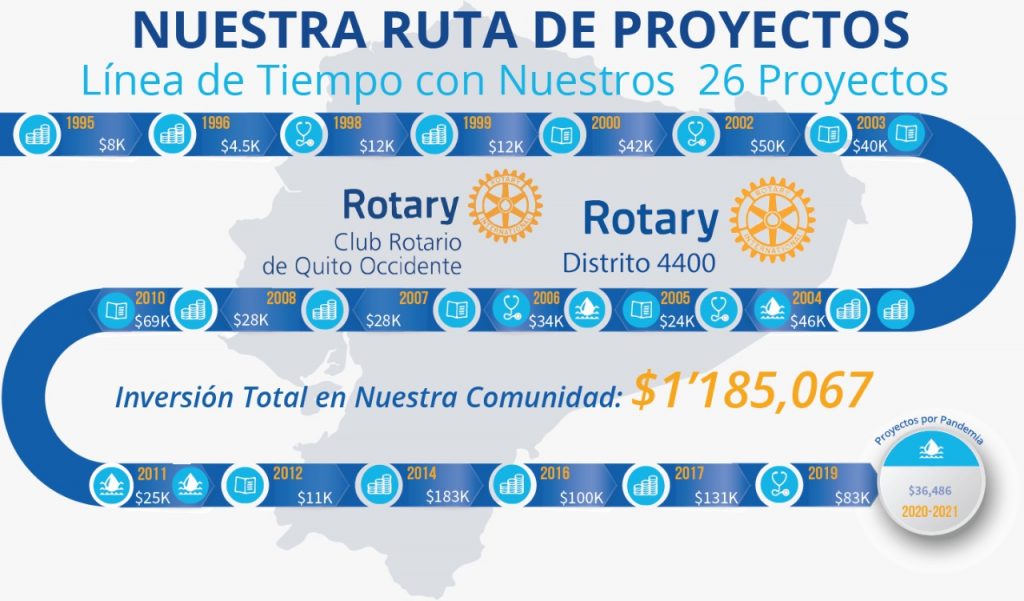 Desde el inicio de la emergencia sanitaria a causa del COVID19, en marzo del 2020 el Club Rotario de Quito Occidente ha entregado a 11 comunidades rurales en todo el Ecuador, alimentos no perecederos a 805 familias, o 3.380 personas, por un valor de $19.185.00. Algunas de estas comunidades: